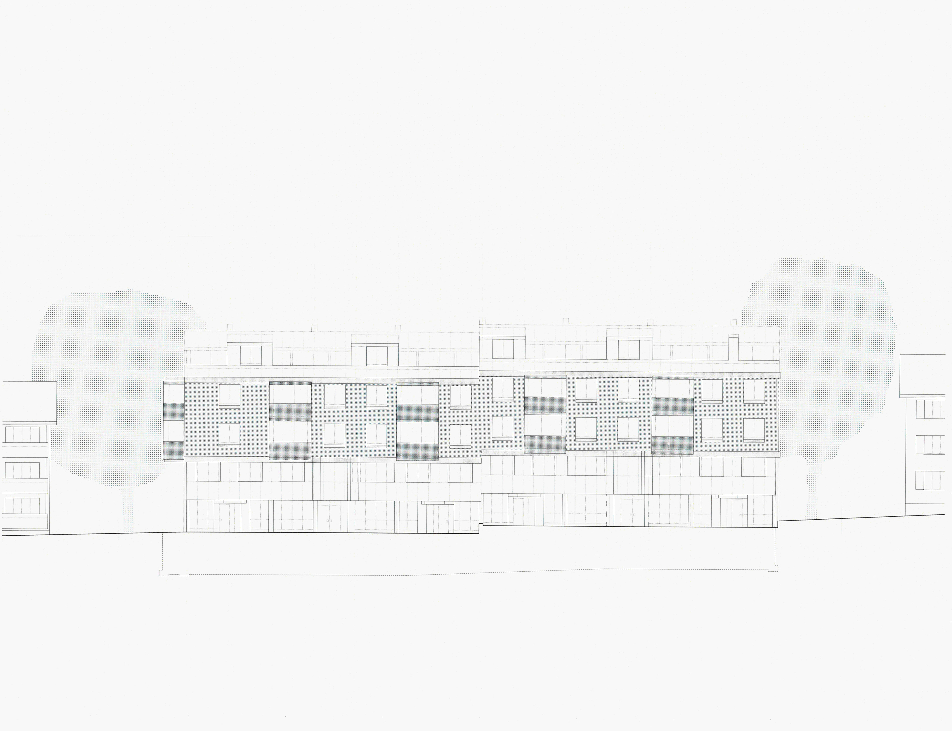 Der hohe Anteil an Grünflächen birgt ein grosses, grössten-teils ungenutztes Potenzial, auf das mit einem spezifischen Wohnungstyp reagiert wird: Maisonetteeinheiten im Erd- und 1. Obergeschoss mit Zugängen von aussen sowie strassen- und gartenseitigen Vorgärten fördern die Verflechtung von Wohn- und Aussenraum und regen eine diverse und intensive Nutzung der Grünräume als private Gärten an. Anders als bei den bestehenden Zeilenbauten sind auch die beiden Treppenhäuser beidseitig zugänglich und verbinden den ruhigen, durchaus attraktiven Strassen-raum mit dem Garten.